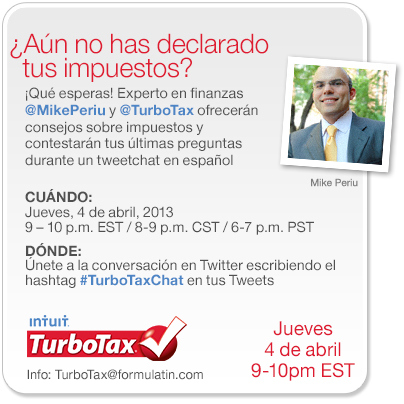 Mike Periu, experto en finanzas y portavoz de TurboTax, estará compartiendo unos consejos muy importantes que te ayudarán a declarar tus impuestos en poco tiempo. Lo hará durante un Tweetchat en español que se llevará a cabo el jueves 4 de abril, entre 9-10 p.m. EST / 6-7 p.m. PST.